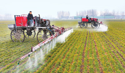 近日,安徽省亳州市农民抢抓农时,积极开展春耕生产,田间地头呈现一派忙碌景象。图为在亳州市利辛县孙集镇许沟口村博远种植专业合作社,农民驾驶自走式喷杆喷雾机在麦田作业。刘勤利摄(人民视觉)